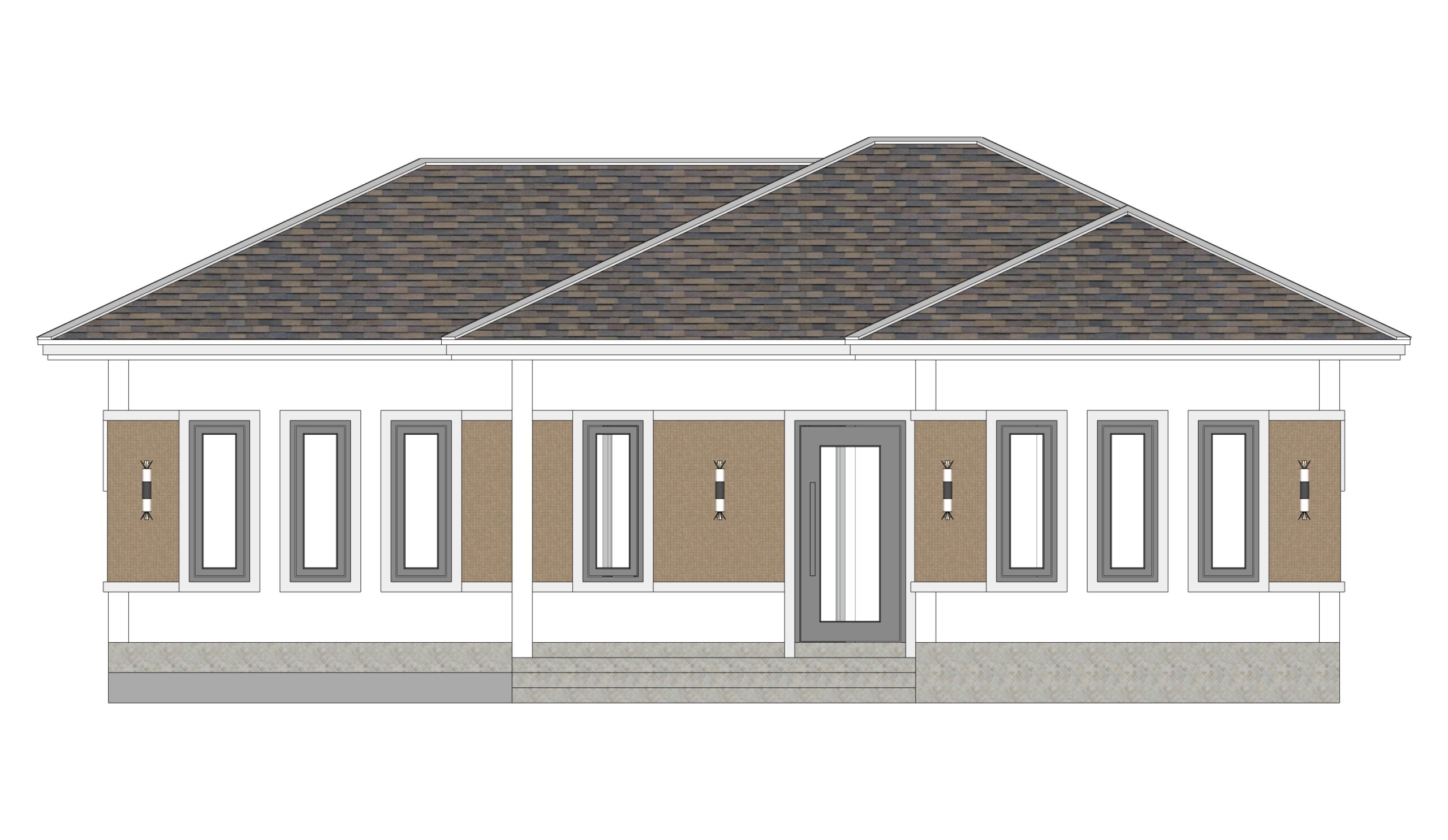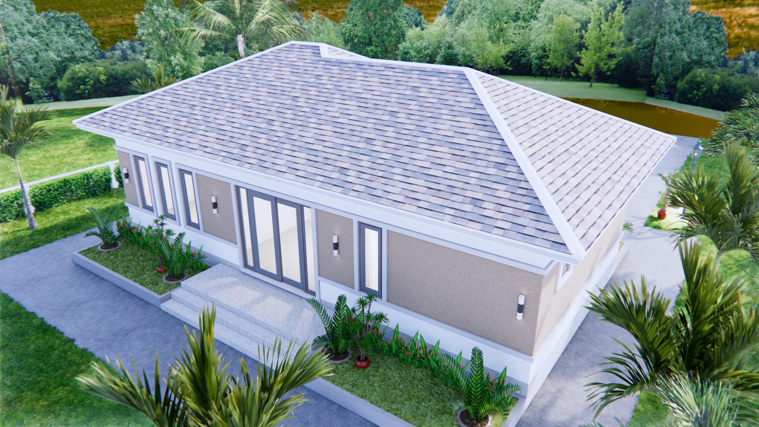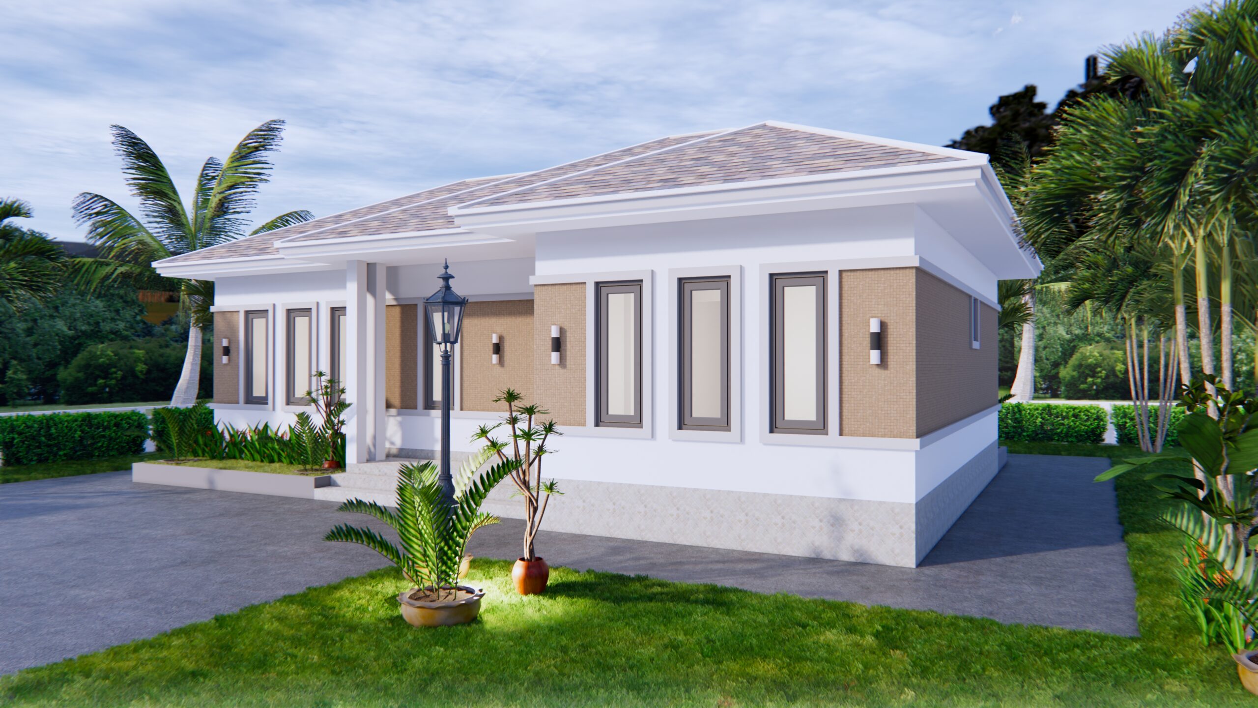 Finally, The Hip roof type is made from Cement tiles (or your local roof tiles) that cover above Gypsum board ceiling . It make the house look clean and modern.